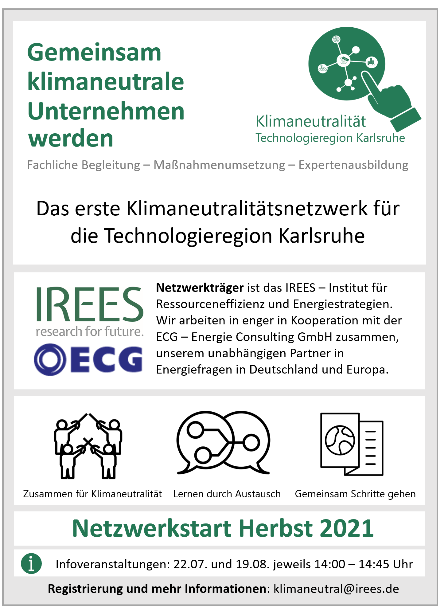 Weitere Informationen und Anmeldung bekommen Sie per Email: klimaneutral@irees.de oder auf der Website https://irees.de/knn-tr-karlsruhe/