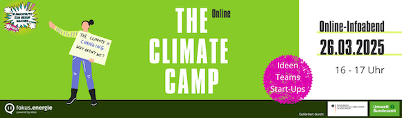 Aktuell läuft bis zum 23.04. die Bewerbungsphase unseres Entrepreneurship-Programms „The Climate Camp“ mit dem Ziel, Projektideen zum Klimaschutz und der Energiewende zu entwickeln und daraus potenzielle Geschäftsmodelle zu formen.
