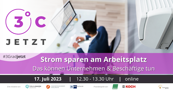 Gemeinsam für das Energiesparen engagieren sich fokus.energie e.V., Handwerkskammer Karlsruhe und Industrie- und Handelskammer Karlsruhe im Rahmen der „3 Grad JETZT“-Initiative (www.3GradJETZT.de) und veranstalten dazu am Montag, 17. Juli, von 12.30 bis 13.30 Uhr online einen speziellen „Brennpunkt“ zum Thema „Hitze, Klimaanlage & Strom sparen am Arbeitsplatz“.