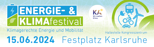 Energie- und Klimafestival am Samstag, 15. Juni, von 11 bis 17 Uhr: Gewissermaßen parallel zum Jugendforum findet vor der Gartenhalle auf dem Festplatz Karlsruhe das zweite Energie- und Klimafestival statt, das von der Stadt Karlsruhe, Messe Karlsruhe, fokus.energie e.V. und weiteren Partnern veranstaltet wird. Schwerpunktthema ist hier die klimagerechte Energie und Mobilität. Dazu gibt es ein umfangreiches Angebot mit Info-Ständen, Bühnenprogramm und Mitmach-Aktionen.