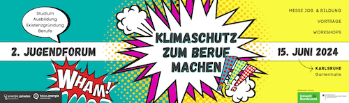 Jugendforum - „Klimaschutz zum Beruf machen“ am Samstag, 15. Juni, von 10.30 bis 17 Uhr in der Karlsruher Gartenhalle: Das vom Umweltbundesamt geförderte Jugendforum richtet sich an jene, die eine Berufstätigkeit mit Sinn suchen und mit ihrer Tätigkeit einen Beitrag für den Klimaschutz und die CO2-Vermeidung leisten wollen. Bei Vorträgen, Workshops und Messe Job & Bildung gibt es alles Wichtige zu Berufen, Ausbildung, Studium und Existenzgründung im Bereich Nachhaltigkeit, Klimaschutz und Energiewende. Auch für Firmen ist das Jugendforum der richtige Rahmen, sich in einem entsprechenden Umfeld zu präsentieren.