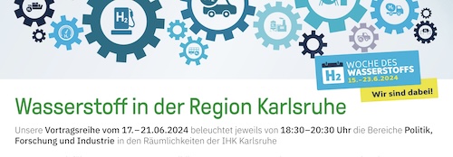 „Woche des Wasserstoffs“: Die Vortragsreihe findet im Rahmen der bundesweiten Aktionswoche vom 17. bis 21. Juni täglich in den Räumlichkeiten der IHK Karlsruhe statt. Förderung und Austausch von Wissen über Wasserstoff als Energieträger: Interessierte erwartet täglich ab 18.30 Uhr ein Programm mit Berichten aus Politik, Forschung und Industrie. Netzwerkpartner dieser Veranstaltung sind: Automotive Engineering Network e.V., DVGW-Forschungsstelle am Engler-Bunte-Institut des KIT, European Institute for Energy Research EIFER, Fraunhofer ICT, fokus.energie e.V., Hochschule Karlsruhe, IHK Karlsruhe, Karlsruhe Institut für Technologie, TechnologieRegion Karlsruhe GmbH und VDE Bezirksverein Mittelbaden.
